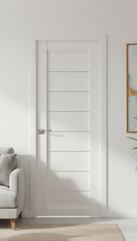Межкомнатная дверь в современном стиле. Царговая конструкция двери позволяет произвести замену любой поврежденной детали. Каждый элемент двери выполнен из качественных материалов - сосна/МДФ высокой плотности/сендвич-панель и окутаны ПВХ-пленкой. За счет использования в конструкции двери высокопрочных материалов, дверь устойчива к влаге и механическим повреждениям, легка в уходе.