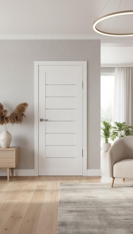 Межкомнатная дверь в современном стиле. Царговая конструкция двери позволяет произвести замену любой поврежденной детали. Каждый элемент двери выполнен из качественных материалов - сосна/МДФ высокой плотности/сендвич-панель и окутаны пленкой из полипропилена. За счет использования в конструкции двери высокопрочных материалов, дверь устойчива к влаге и механическим повреждениям, легка в уходе.