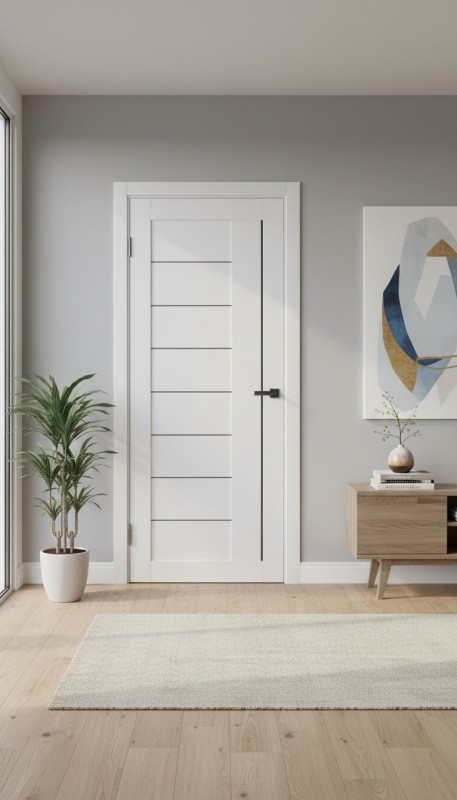 Межкомнатная дверь в современном стиле. Царговая конструкция двери позволяет произвести замену любой поврежденной детали. Каждый элемент двери выполнен из качественных материалов - сосна/МДФ высокой плотности/сендвич-панель и окутаны ПВХ-пленкой. За счет использования в конструкции двери высокопрочных материалов, дверь устойчива к влаге и механическим повреждениям, легка в уходе.