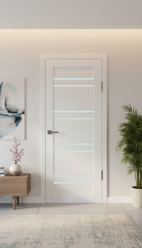 Межкомнатная дверь в современном стиле. Царговая конструкция двери позволяет произвести замену любой поврежденной детали. Каждый элемент двери выполнен из качественных материалов - сосна/МДФ высокой плотности/сендвич-панель и окутаны ПВХ-пленкой. За счет использования в конструкции двери высокопрочных материалов, дверь устойчива к влаге и механическим повреждениям, легка в уходе.