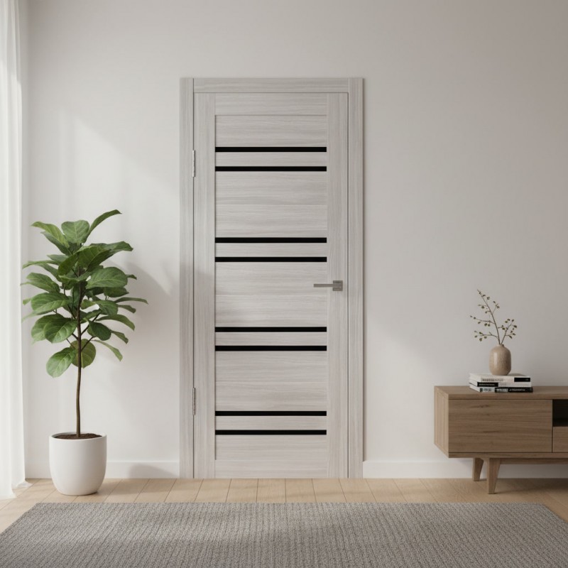 Межкомнатная дверь в современном стиле. Царговая конструкция двери позволяет произвести замену любой поврежденной детали. Каждый элемент двери выполнен из качественных материалов - сосна/МДФ высокой плотности/сендвич-панель и окутаны ПВХ-пленкой. За счет использования в конструкции двери высокопрочных материалов, дверь устойчива к влаге и механическим повреждениям, легка в уходе.