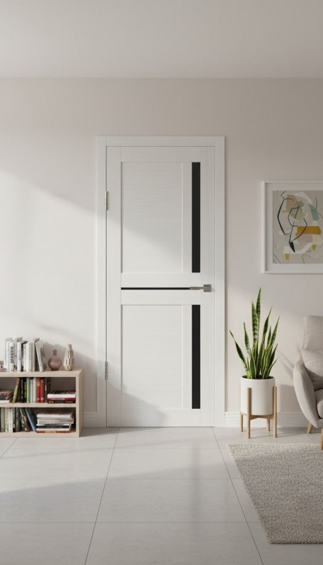 Межкомнатная дверь в современном стиле. Царговая конструкция двери позволяет произвести замену любой поврежденной детали. Каждый элемент двери выполнен из качественных материалов - сосна/МДФ высокой плотности/сендвич-панель и окутаны ПВХ-пленкой. За счет использования в конструкции двери высокопрочных материалов, дверь устойчива к влаге и механическим повреждениям, легка в уходе.