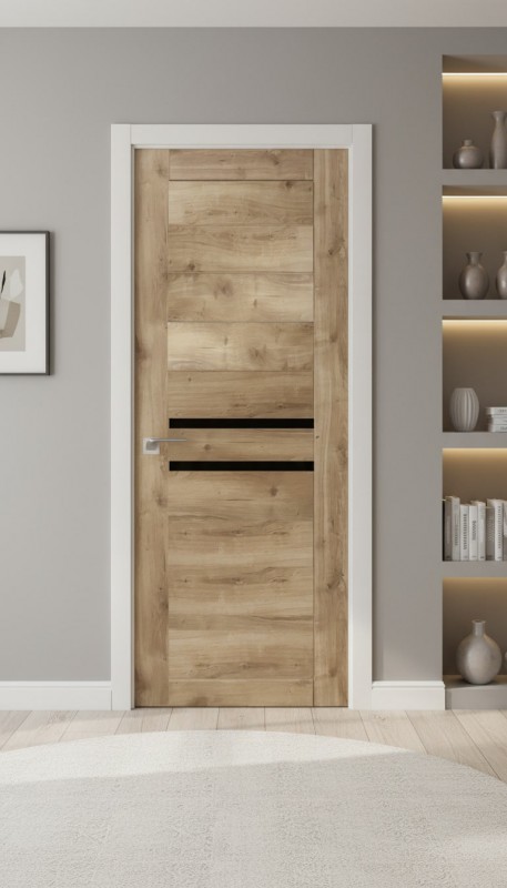 Межкомнатная дверь в современном стиле. Царговая конструкция двери позволяет произвести замену любой поврежденной детали. Каждый элемент двери выполнен из качественных материалов - сосна/МДФ высокой плотности/сендвич-панель и окутаны ПВХ-пленкой. За счет использования в конструкции двери высокопрочных материалов, дверь устойчива к влаге и механическим повреждениям, легка в уходе.